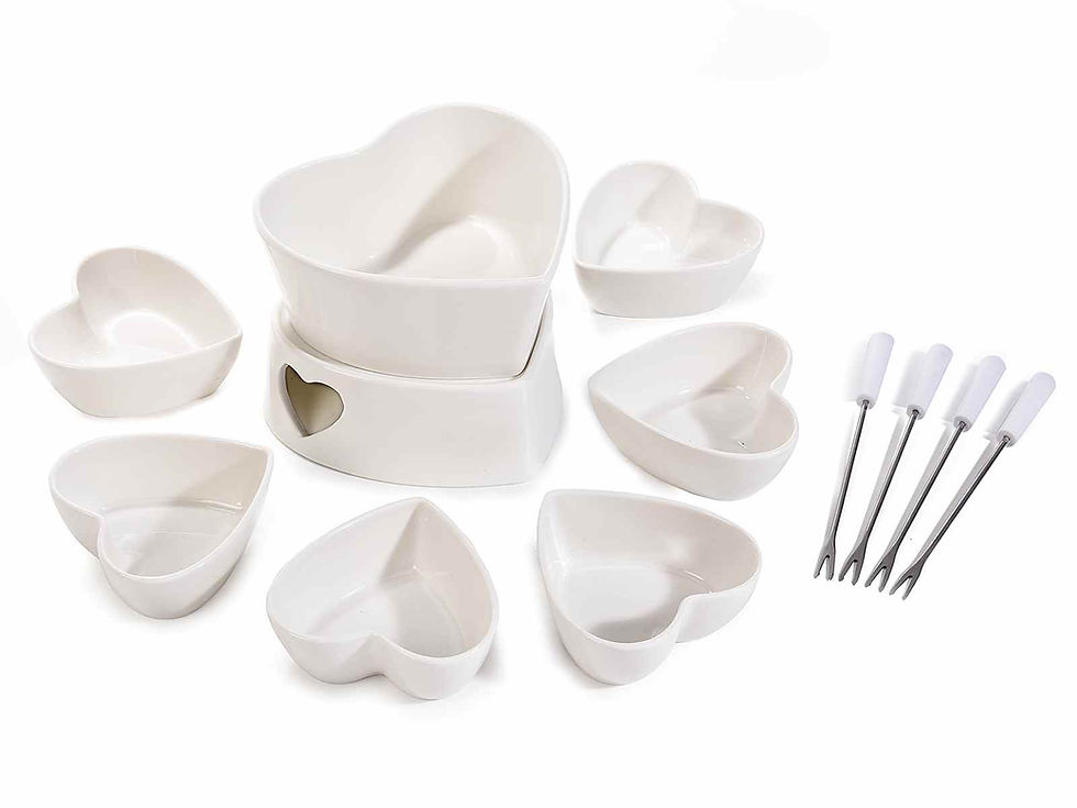 Heart-shaped porcelain fondue set with 6 cups and 4 forks